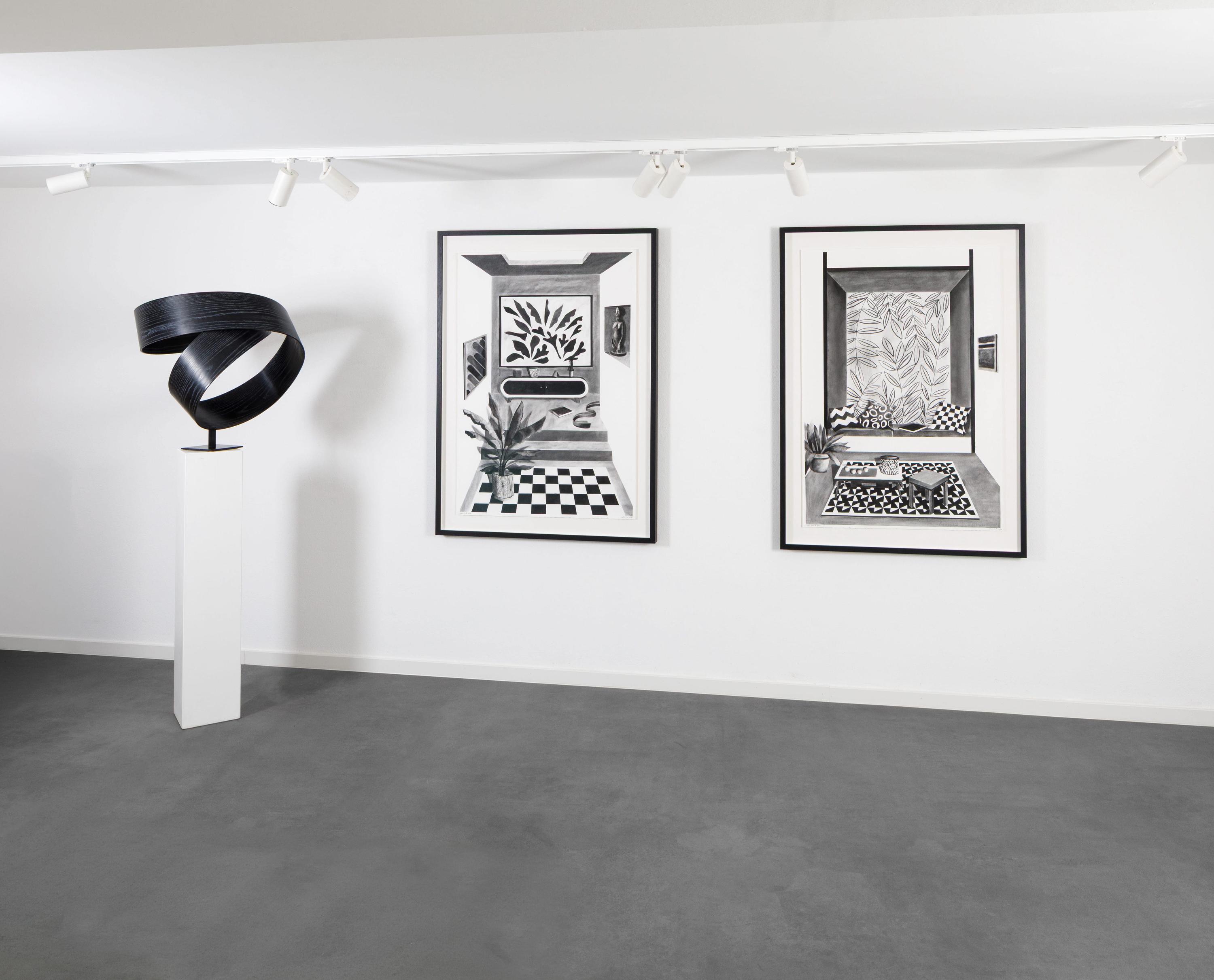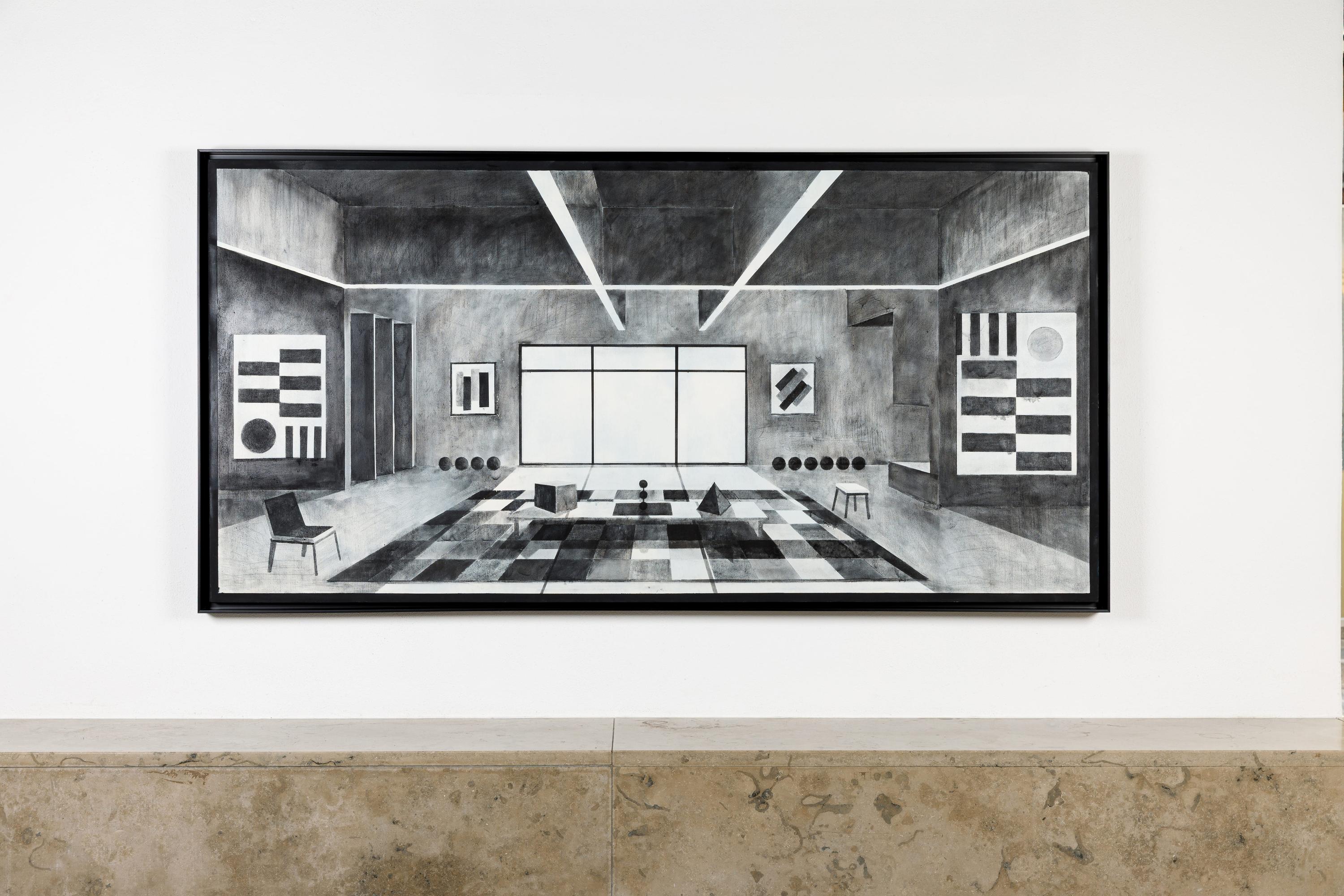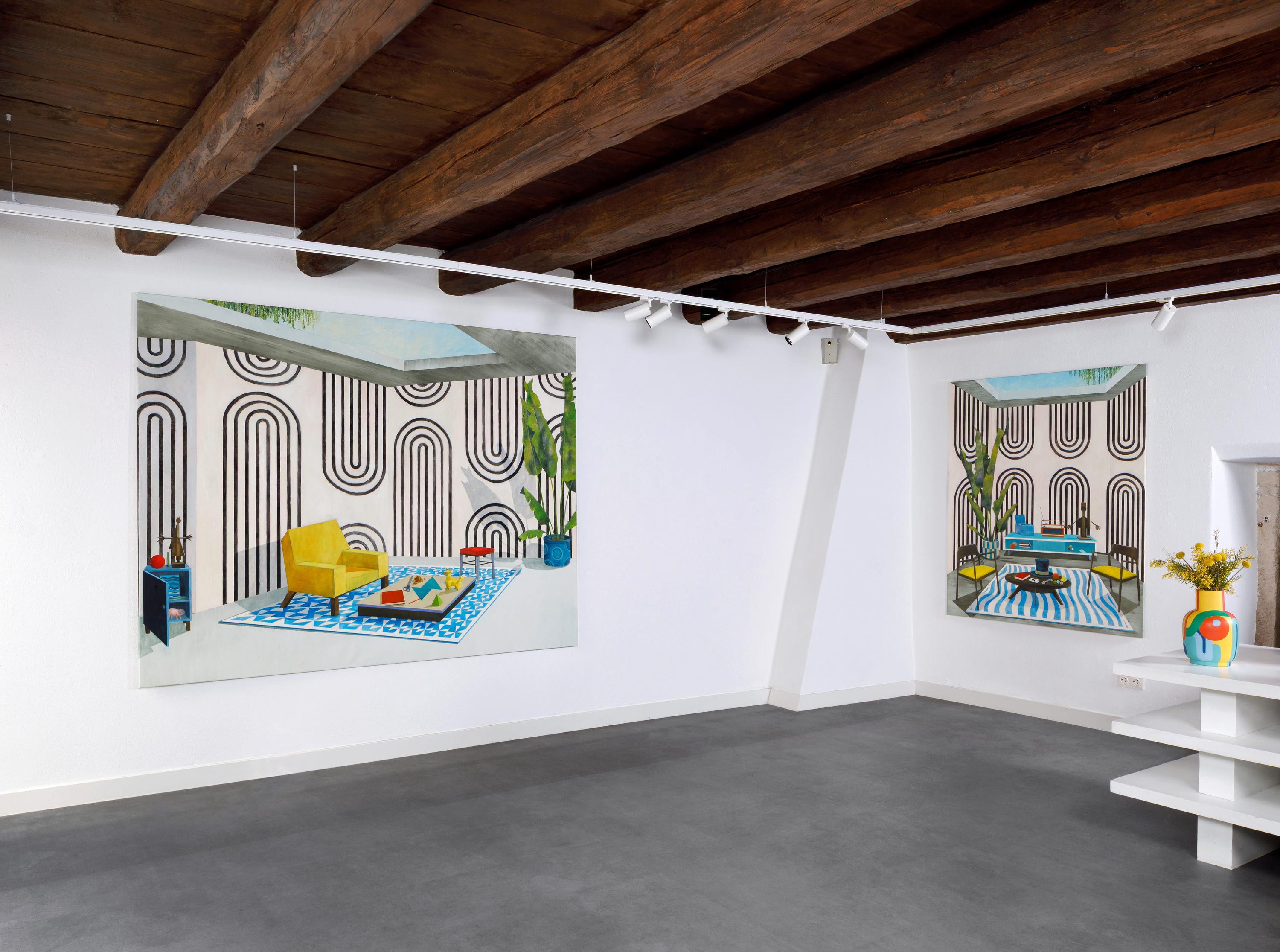 His spaces seem familiar – living rooms, niches, window axes, carpets, tables, plants, objects. And yet they elude clarity. Perspectives shift subtly, architectural lines condense into ornamental rhythms, geometric forms enter into dialogue with organic motifs. A radio, a book, a sculpture, an empty chair – each element seems to be the bearer of its own time. Past, present, and memory overlap.